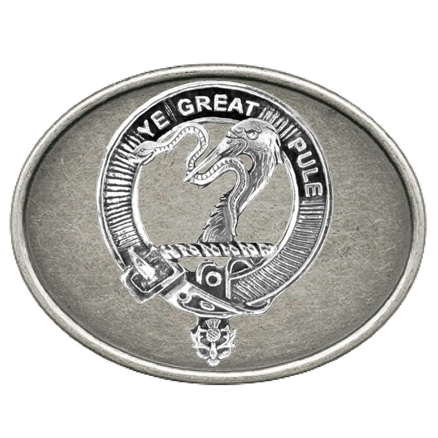 The belt and buckle design framing the crest has long symbolized membership in a Clan, historically presented by the Clan Chief as a mark of loyalty and kinship.